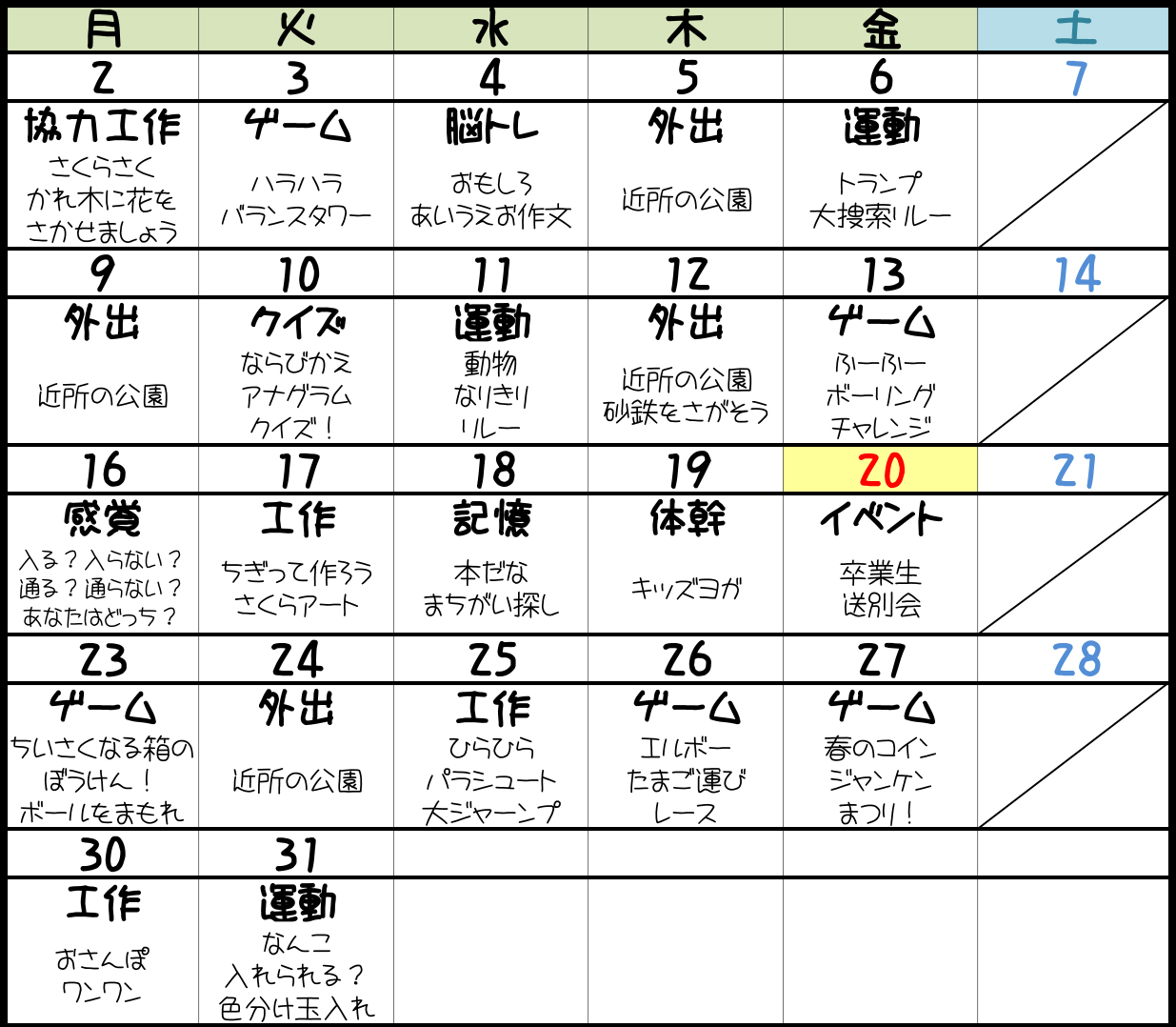 ※天候(雨、台風)や気温、利用される児童の人数によって活動内容を変更することがあります※20日の祝祭日は、お弁当もしくはお昼代、水筒、タオル、ハンカチ、靴下の準備をお願い致します